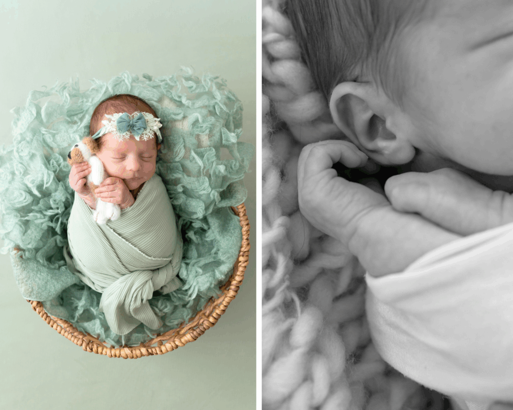 The most ideal time to take newborn photos is within the first two weeks of birth. This is when they are typically the sleepiest and most flexible. A sleepy baby is generally a happy baby, which is why I recommend scheduling photos around feeding and nap time as much as possible.
